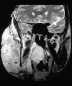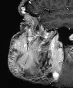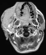 There is an enormous facial angioma extending through the palate to almost obliterate the oro-pharyngeal airway. A small extension into the middle cranial fossa from the infra temporal fossa is shown. Signal change is present in the immediately overlying brain suggesting a breach in the dura. Bone is partly destroyed in and around the right orbit, especially the right frontal bone.