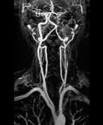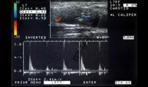 There is a critical stenosis of the left internal carotid artery (ICA) at its origin. Moderate irregularity and narrowing of the right ICA is noted at its origin. Carotid Doppler ultrasound quantifies the left ICA stenosis to be greater than 70% and the spectral waveform pattern suggests string flow or a near occlusion. The right ICA stenosis was measured at between 50-59%.