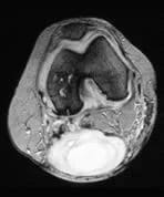 There is a large posterior popliteal fluid collection. Marked tri-compartmental degenerative change in the medial joint compartment is also seen. These latter changes are in keeping with secondary avascular necrosis. Also present is a large joint effusion with marked synovitis and synovial hypertrophy.